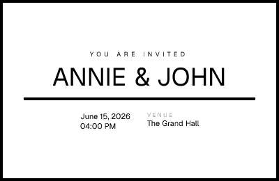 Your wedding deserves an invitation as beautiful as the day itself. Browse our handcrafted wedding templates — from elegant serif designs to modern minimalist styles. Customize the text, date, and venue directly on the template. Share a personalized link with each guest and track RSVPs in real-time.